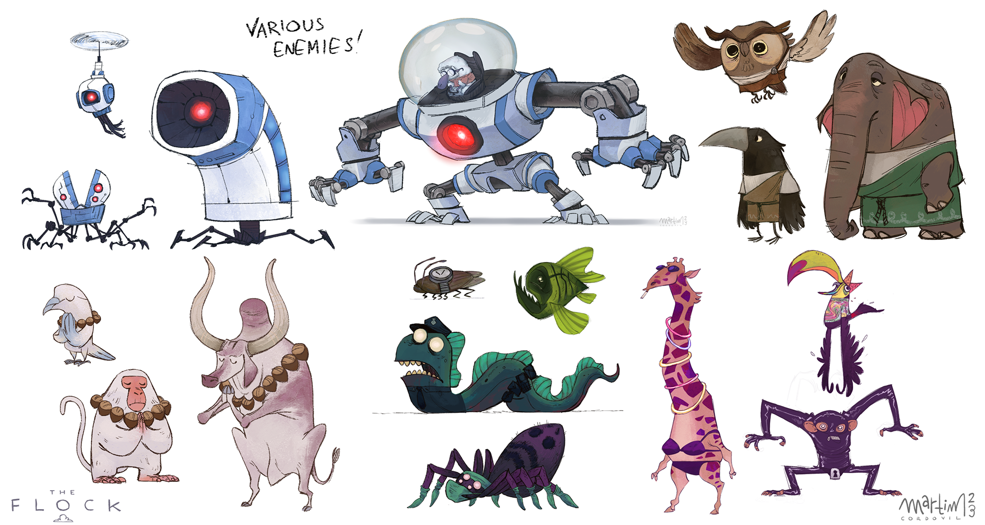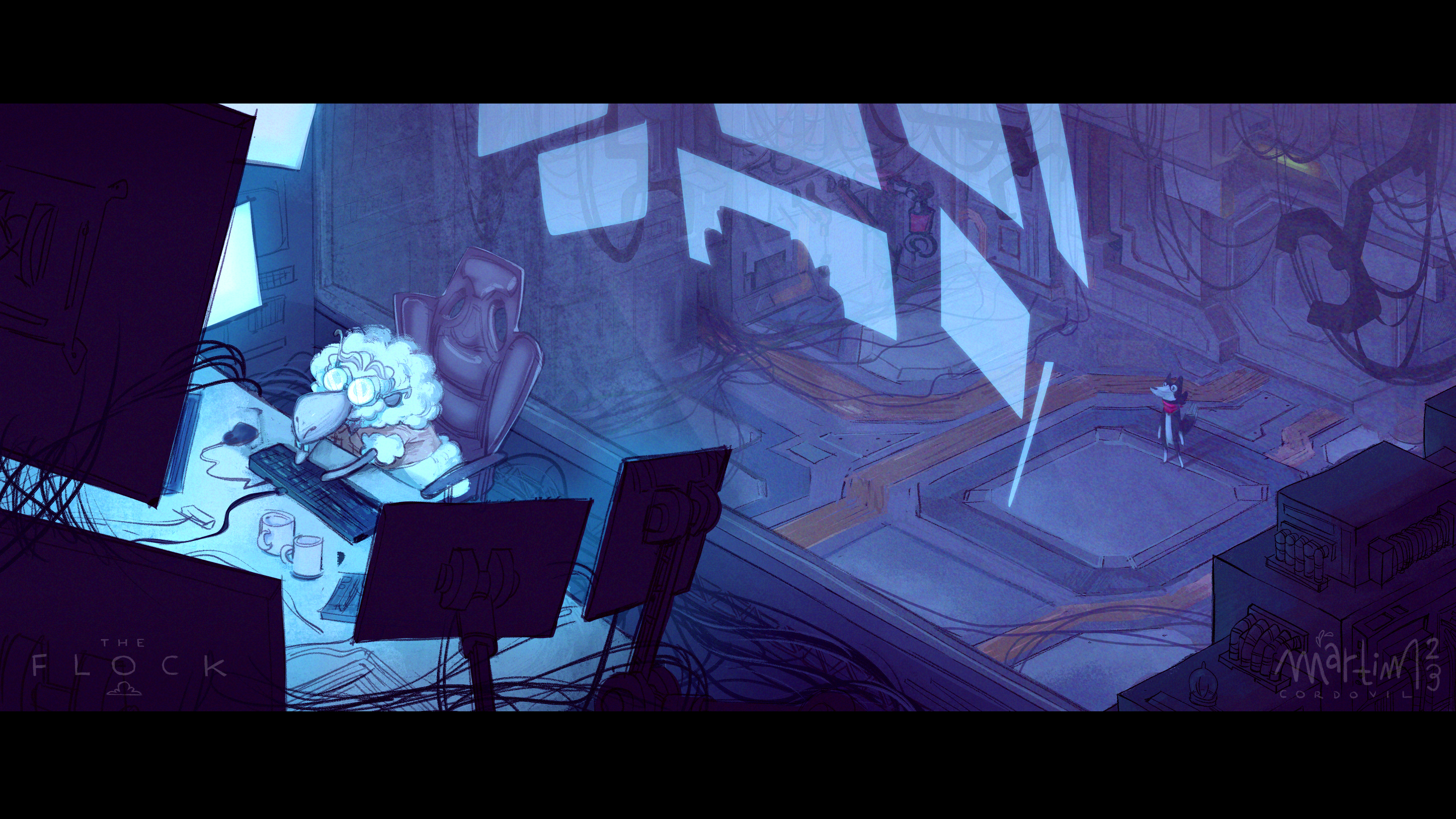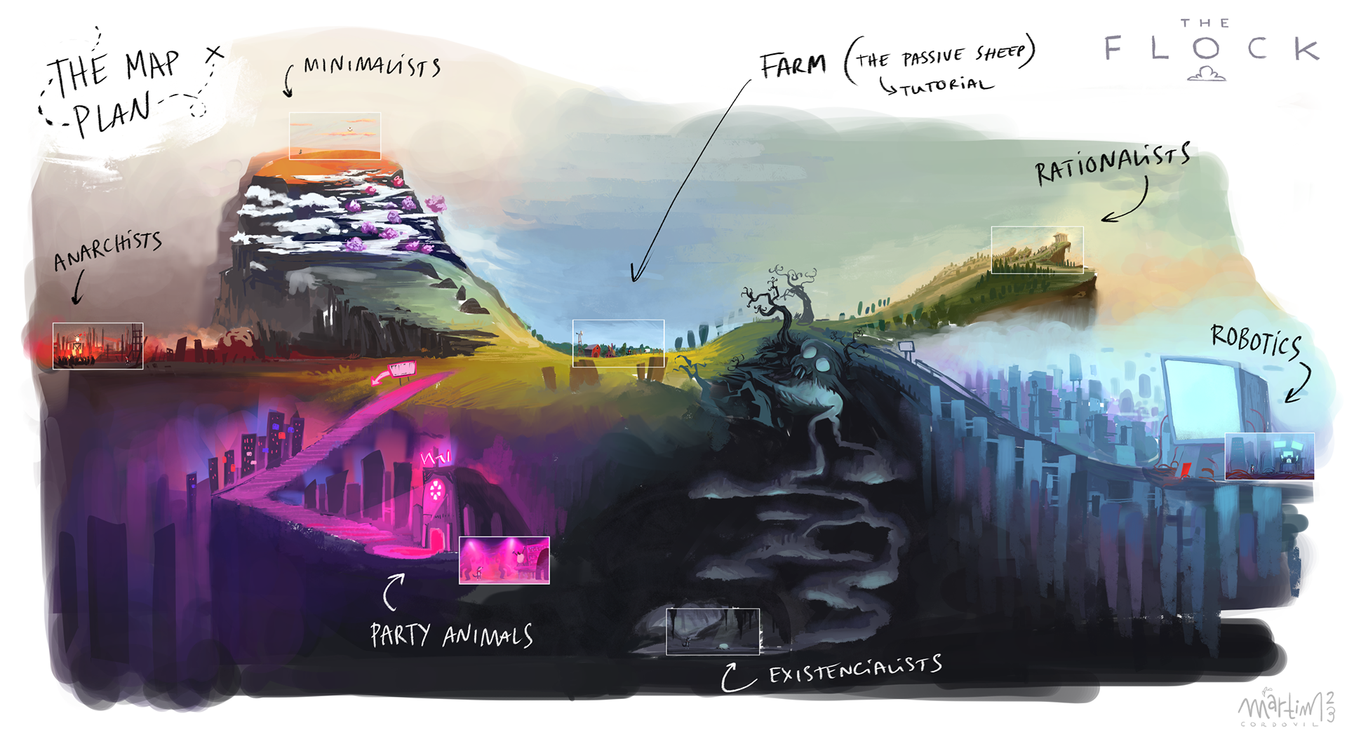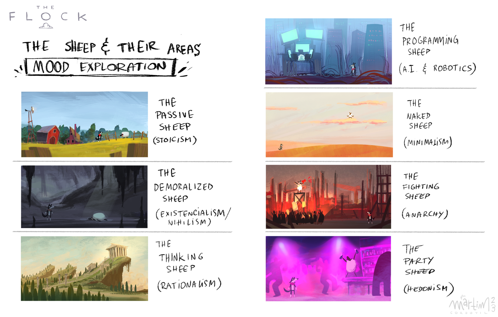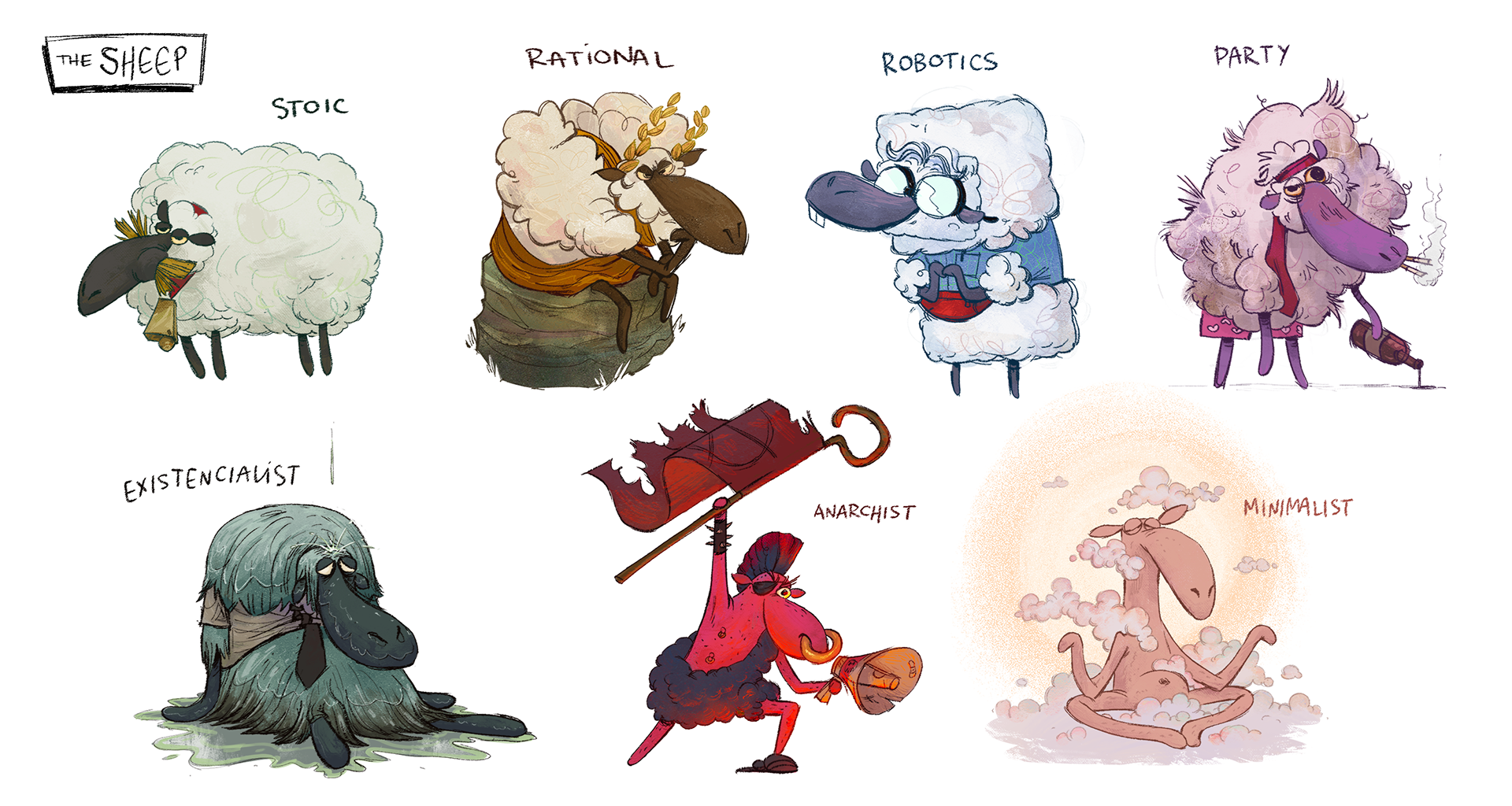 Visual development exercises of an original idea for a video game. You play as a border collie who woke up to find that her flock of sheep has escaped, each one with different reasons for it inspired by different schools of philosophy.